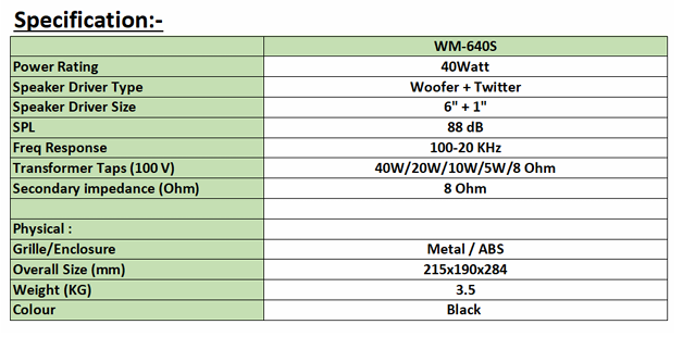 The WM-640S is a compact 2-way bass-reflex speaker with a wide frequency range, making it ideal for both announcements and music playback. It’s designed for versatility, accommodating both high-impedance and low-impedance setups. The speaker also features rotary power selection, allowing you to easily adjust the power output to suit the